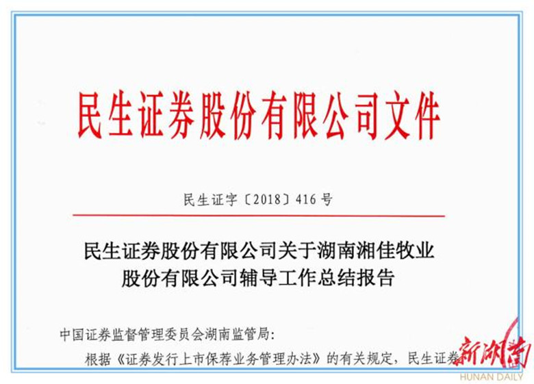 11月5日,湖南證監(jiān)局官網(wǎng)披露了《民生證券關(guān)于湖南湘佳牧業(yè)股份有限公司輔導(dǎo)工作總結(jié)報(bào)告》(簡(jiǎn)稱“總結(jié)”)。在這份總結(jié)中,民生證券指出,已經(jīng)完成了對(duì)湘佳牧業(yè)的上市輔導(dǎo)工作。