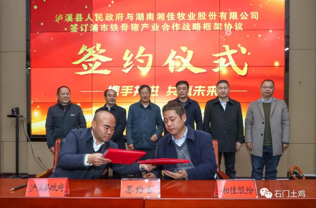 2月8日,湖南湘西自治州瀘溪縣人民政府與湖南湘佳牧業(yè)股份有限公司就做大做強該縣浦市鐵骨豬產業(yè),簽訂合作戰(zhàn)略框架協(xié)議。湖南農大印遇龍院士工作團隊、瀘溪縣人民政府、湘佳股份三方將共享盛舉,精誠合作,讓這一養(yǎng)在深山人未識的“黑豬極品”走出湘西。